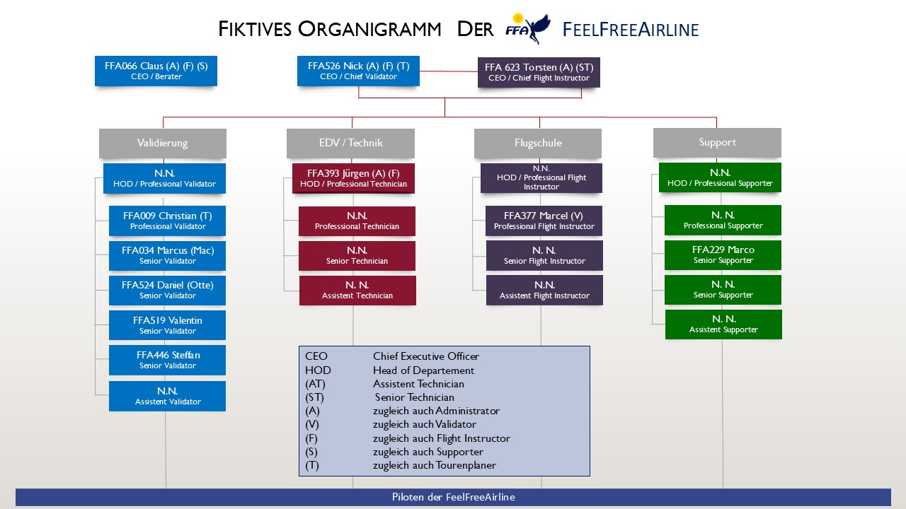 Die virtuelle FeelFreeAirline wird im operativen Bereich geleitet von den beiden Geschäftsführern - CEO, in enger Zusammenarbeit für die strategische Ausrichtung mit den Abteilungsleitern (Head of Departement) - HOD.